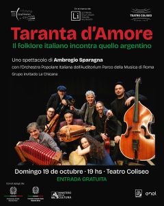 ESPECTÁCULO: TARANTA D’AMORE DOMINGO 19 DE OCTUBRE – 19.00 horas TEATRO COLISEO Marcelo Torcuato de Alvear 1125 Entrada gratuita, retirando las entradas en la boletería del Teatro Coliseo a partir del martes 14 de octubre, de martes a sábados de 12:00 hs a 20:00 hs. Máximo 4 entradas por persona El Istituto Italiano de Cultura de Buenos Aires y el Teatro […]