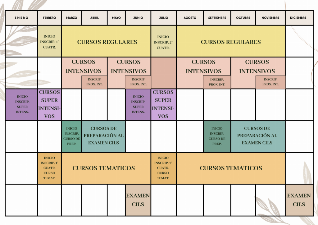La oferta se compone de cursos regulares (tres horas semanales durante un cuatrimestre), intensivos (seis horas semanales durante dos meses) y superintensivos (dos horas y media de lunes a viernes durante un mes).
