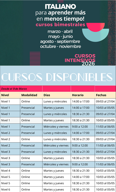 Con una carga horaria de seis horas semanales, los cursos finalizarán a principios de mayo. Pensados para aprender italiano rápidamente, concentran el estudio en un período más corto.