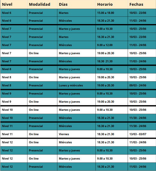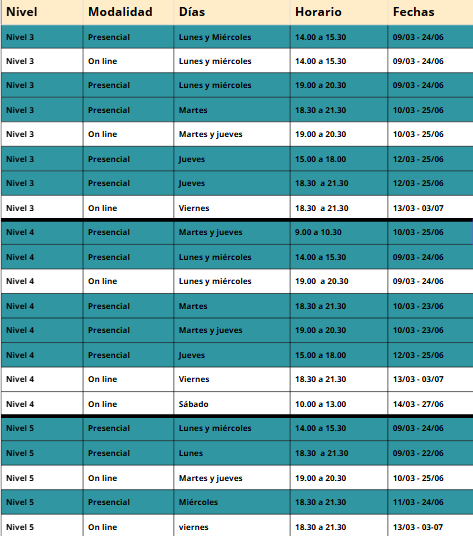 Los cursos ofrecidos van del Nivel 1 al Nivel 6 y están disponibles en los siguientes horarios: