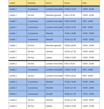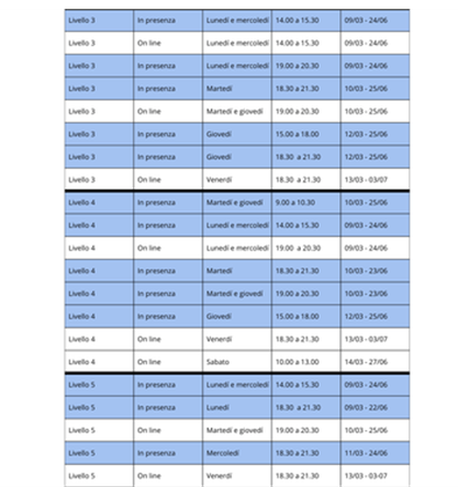 I corsi offerti vanno dal livello 1 al livello 6 e sono disponibili ai seguenti orari: